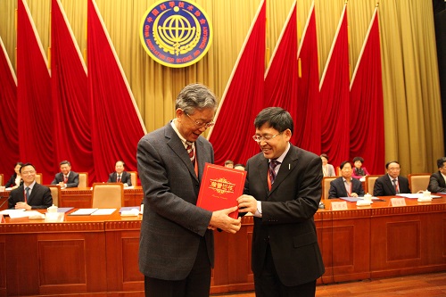 王恩东向八届委员会主席唐启升颁发荣誉证书